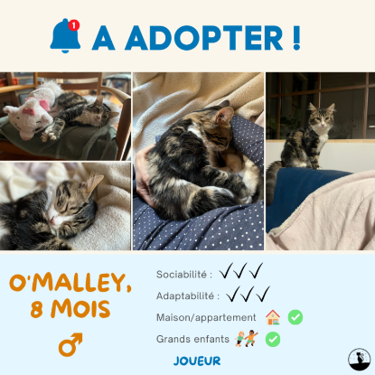 Pour O’Malley, nous souhaiterions trouver une famille aimante, très très présente, avec de grands ados. O’Malley étant un peu timide, il risquerait d’avoir peur au contact d’enfants trop petits. Par ailleurs, un petit balcon serait idéal, car O’Malley adore regarder les oiseaux dans les arbres, ou faire la commère