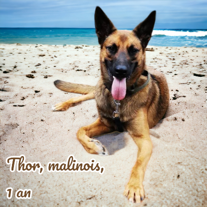 Thor est un adorable chien malinois croisé border collie d'un 1 an, de taille moyenne (25kg). Il est très pot de colle, câlin, très bon gardien et protecteur, adore apprendre des tours. Il sait très bien se faire comprendre, peu joueur ou alors seul. Il est propre. Il accepte harnais collier muselière.