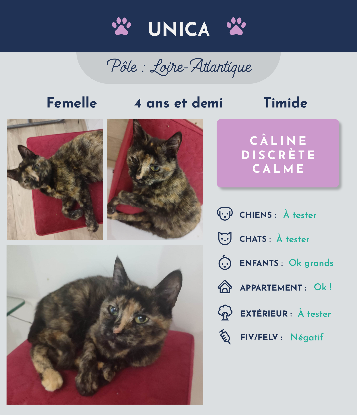 Coucou, moi c'est Única. Je suis une petite chatte de 4 ans et demi très mignonne. J’ai besoin de temps pour être à l'aise, mais une fois en confiance, je vous montrerai tout mon amour ! Ce que je préfère c'est les câlins, et me blottir sur les genoux.