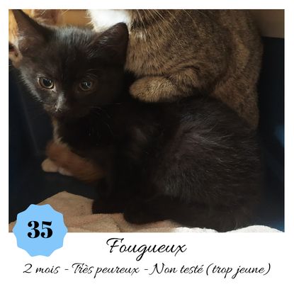 URGENCE EUTHANASIE ! Fougueux est un chaton de 2 mois peureux (en situation de fourrière) qui vous attend dans une fourrière du 35. ATTENTION SORTIE AU PLUS TARD LE 11/10/2019 (avant euthanasie)! Pour adopter, c'est facile : ➡️ On se rend sur la page facebook d'Urgence Fourrière de Bretagne (UFB) -> https://www.facebook.com/sosfourrieresbreizh/ ➡️ On vient en message privé sur la page UFB ➡️ On remplit le questionnaire ➡️ Si le questionnaire est validé, on se rend disponible pour la pré-visite ➡️ On se rend aussi disponible pour venir chercher le loulou en fourrière Les chats sortent de fourrière primo-vaccinés et identifiés. Restera à charge de l’adoptant le rappel de vaccin et la stérilisation qui est OBLIGATOIRE. Les femelles en fourrière ayant été trouvées dans la rue, il y a fort à parier que nombre d'entre elles en âge de l'être soient gestantes ... ---- A PROPOS D'URGENCE FOURRIERE DE BRETAGNE (UFB) Nous sommes un COLLECTIF d'ASSOCIATIONS DE PROTECTION ANIMALE (qui rassemble notamment Moustaches et Compagnie, Bêtes de Scène, les Pachas, Chats Libres de Berné, etc, etc....) Le BUT de ce collectif d'associations est donc de SORTIR ces animaux des fourrières surchargées en les faisant ADOPTER de manière LEGALE par des familles ou en leur trouvant des FAMILLES D'ACCUEIL lorsque des places en association se libèrent.