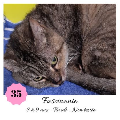 URGENCE EUTHANASIE ! Fascinante est une minette de 8-9 ans timide (en situation de fourrière) qui vous attend dans une fourrière du 35. ATTENTION SORTIE AU PLUS TARD LE 11/10/2019 (avant euthanasie)! Pour adopter, c'est facile : ➡️ On se rend sur la page facebook d'Urgence Fourrière de Bretagne (UFB) -> https://www.facebook.com/sosfourrieresbreizh/ ➡️ On vient en message privé sur la page UFB ➡️ On remplit le questionnaire ➡️ Si le questionnaire est validé, on se rend disponible pour la pré-visite ➡️ On se rend aussi disponible pour venir chercher le loulou en fourrière Les chats sortent de fourrière primo-vaccinés et identifiés. Restera à charge de l’adoptant le rappel de vaccin et la stérilisation qui est OBLIGATOIRE. Les femelles en fourrière ayant été trouvées dans la rue, il y a fort à parier que nombre d'entre elles en âge de l'être soient gestantes ... ---- A PROPOS D'URGENCE FOURRIERE DE BRETAGNE (UFB) Nous sommes un COLLECTIF d'ASSOCIATIONS DE PROTECTION ANIMALE (qui rassemble notamment Moustaches et Compagnie, Bêtes de Scène, les Pachas, Chats Libres de Berné, etc, etc....) Le BUT de ce collectif d'associations est donc de SORTIR ces animaux des fourrières surchargées en les faisant ADOPTER de manière LEGALE par des familles ou en leur trouvant des FAMILLES D'ACCUEIL lorsque des places en association se libèrent.