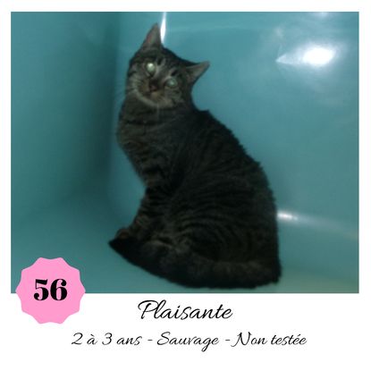 URGENCE EUTHANASIE ! Plaisante est une minette de 2-3 ans sauvage (en situation de fourrière) qui vous attend dans une fourrière du 56. ATTENTION SORTIE AU PLUS TARD LE 11/10/2019 (avant euthanasie)! Pour adopter, c'est facile : ➡️ On se rend sur la page facebook d'Urgence Fourrière de Bretagne (UFB) -> https://www.facebook.com/sosfourrieresbreizh/ ➡️ On vient en message privé sur la page UFB ➡️ On remplit le questionnaire ➡️ Si le questionnaire est validé, on se rend disponible pour la pré-visite ➡️ On se rend aussi disponible pour venir chercher le loulou en fourrière Les chats sortent de fourrière primo-vaccinés et identifiés. Restera à charge de l’adoptant le rappel de vaccin et la stérilisation qui est OBLIGATOIRE. Les femelles en fourrière ayant été trouvées dans la rue, il y a fort à parier que nombre d'entre elles en âge de l'être soient gestantes ... ---- A PROPOS D'URGENCE FOURRIERE DE BRETAGNE (UFB) Nous sommes un COLLECTIF d'ASSOCIATIONS DE PROTECTION ANIMALE (qui rassemble notamment Moustaches et Compagnie, Bêtes de Scène, les Pachas, Chats Libres de Berné, etc, etc....) Le BUT de ce collectif d'associations est donc de SORTIR ces animaux des fourrières surchargées en les faisant ADOPTER de manière LEGALE par des familles ou en leur trouvant des FAMILLES D'ACCUEIL lorsque des places en association se libèrent.