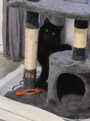 Tornade est un chat mâle a poil long de couleur noir , de race Européen stérilisé, vacciné et protégé contre les parasites internes et externes.
