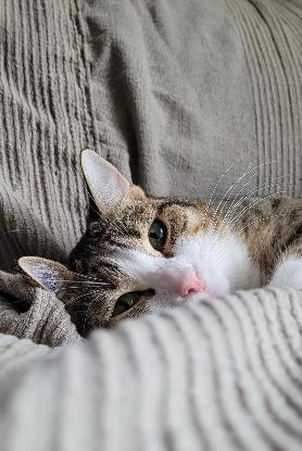 Elle a environ 1 an. C'est une toute petite minette plutôt craintive et timide mais adorable une fois qu'elle a accordé sa confiance. Elle cherche la compagnie humaine, est joueuse, très câline et ronronne comme une chaudière ?