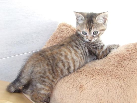 Sa robe tigrée tricolore est teintée de roux et avec sa petite bouille tigrée crème cette petite chatte est vraiment magnifique. Son poil est court mais très épais.