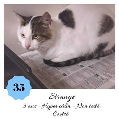 URGENCE EUTHANASIE ! Strange est un adorable matou de 3 an hyper câlin qui vous attend dans une fourrière du 35. ATTENTION SORTIE AU PLUS TARD LE 18/10/2019 (avant euthanasie)! Pour adopter, c'est facile : ➡️ On se rend sur la page facebook d'Urgence Fourrière de Bretagne (UFB) -> https://www.facebook.com/sosfourrieresbreizh/ ➡️ On vient en message privé sur la page UFB ➡️ On remplit le questionnaire ➡️ Si le questionnaire est validé, on se rend disponible pour la pré-visite ➡️ On se rend aussi disponible pour venir chercher le loulou en fourrière Les chats sortent de fourrière primo-vaccinés et identifiés. Restera à charge de l’adoptant le rappel de vaccin et la stérilisation qui est OBLIGATOIRE. Les femelles en fourrière ayant été trouvées dans la rue, il y a fort à parier que nombre d'entre elles en âge de l'être soient gestantes ... ---- A PROPOS D'URGENCE FOURRIERE DE BRETAGNE (UFB) Nous sommes un COLLECTIF d'ASSOCIATIONS DE PROTECTION ANIMALE (qui rassemble notamment Moustaches et Compagnie, Bêtes de Scène, les Pachas, Chats Libres de Berné, etc, etc....) Le BUT de ce collectif d'associations est donc de SORTIR ces animaux des fourrières surchargées en les faisant ADOPTER de manière LEGALE par des familles ou en leur trouvant des FAMILLES D'ACCUEIL lorsque des places en association se libèrent.
