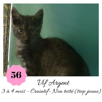 URGENCE EUTHANASIE ! Vif d'Argent est une jolie minette de 3-4 mois craintive ( en situation de fourrière) qui vous attend dans une fourrière du 56. ATTENTION SORTIE AU PLUS TARD LE 18/10/2019 (avant euthanasie)! Pour adopter, c'est facile : ➡️ On se rend sur la page facebook d'Urgence Fourrière de Bretagne (UFB) -> https://www.facebook.com/sosfourrieresbreizh/ ➡️ On vient en message privé sur la page UFB ➡️ On remplit le questionnaire ➡️ Si le questionnaire est validé, on se rend disponible pour la pré-visite ➡️ On se rend aussi disponible pour venir chercher le loulou en fourrière Les chats sortent de fourrière primo-vaccinés et identifiés. Restera à charge de l’adoptant le rappel de vaccin et la stérilisation qui est OBLIGATOIRE. Les femelles en fourrière ayant été trouvées dans la rue, il y a fort à parier que nombre d'entre elles en âge de l'être soient gestantes ... ---- A PROPOS D'URGENCE FOURRIERE DE BRETAGNE (UFB) Nous sommes un COLLECTIF d'ASSOCIATIONS DE PROTECTION ANIMALE (qui rassemble notamment Moustaches et Compagnie, Bêtes de Scène, les Pachas, Chats Libres de Berné, etc, etc....) Le BUT de ce collectif d'associations est donc de SORTIR ces animaux des fourrières surchargées en les faisant ADOPTER de manière LEGALE par des familles ou en leur trouvant des FAMILLES D'ACCUEIL lorsque des places en association se libèrent.