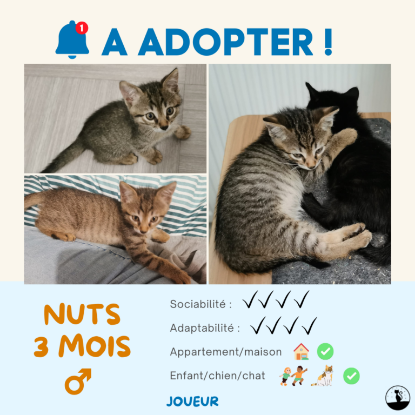 Il réclamera des cessions de jeux endiablées, avec enfants, chats, mais aussi chien ! Nuts est un chaton très sociable, bien dans ses patounes. Et quand il est fatigué, il se languit des câlins
