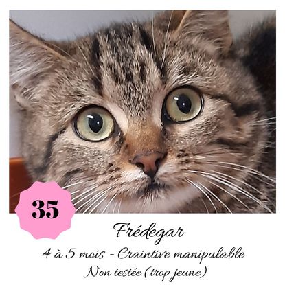 URGENCE EUTHANASIE ! Frédegar est une jolie minette de 4-5 mois craintive (en situation de fourrière) qui vous attend dans une fourrière du 35. ATTENTION SORTIE AU PLUS TARD LE 25/10/2019 (avant euthanasie)! Pour adopter, c'est facile : ➡️ On se rend sur la page facebook d'Urgence Fourrière de Bretagne (UFB) -> https://www.facebook.com/sosfourrieresbreizh/ ➡️ On vient en message privé sur la page UFB ➡️ On remplit le questionnaire ➡️ Si le questionnaire est validé, on se rend disponible pour la pré-visite ➡️ On se rend aussi disponible pour venir chercher le loulou en fourrière Les chats sortent de fourrière primo-vaccinés et identifiés. Restera à charge de l’adoptant le rappel de vaccin et la stérilisation qui est OBLIGATOIRE. Les femelles en fourrière ayant été trouvées dans la rue, il y a fort à parier que nombre d'entre elles en âge de l'être soient gestantes ... ---- A PROPOS D'URGENCE FOURRIERE DE BRETAGNE (UFB) Nous sommes un COLLECTIF d'ASSOCIATIONS DE PROTECTION ANIMALE (qui rassemble notamment Moustaches et Compagnie, Bêtes de Scène, les Pachas, Chats Libres de Berné, etc, etc....) Le BUT de ce collectif d'associations est donc de SORTIR ces animaux des fourrières surchargées en les faisant ADOPTER de manière LEGALE par des familles ou en leur trouvant des FAMILLES D'ACCUEIL lorsque des places en association se libèrent.
