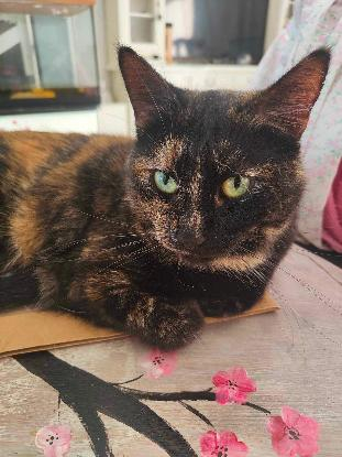 Pretty, écaille de tortue, a 4 ans elle est un peu sur la réserve, et est de moins en moins craintive. Elle est stérilisée et testée négative FIV et Felv. Ok chien et ses congénères. Un extérieur lui serait bénéfique.