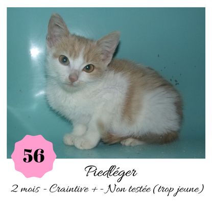 URGENCE EUTHANASIE ! Pied Léger est une minette de 2 mois craintive (en situation de fourrière) qui vous attend dans une fourrière du 56. ATTENTION SORTIE AU PLUS TARD LE 25/10/2019 (avant euthanasie)! Pour adopter, c'est facile : ➡️ On se rend sur la page facebook d'Urgence Fourrière de Bretagne (UFB) -> https://www.facebook.com/sosfourrieresbreizh/ ➡️ On vient en message privé sur la page UFB ➡️ On remplit le questionnaire ➡️ Si le questionnaire est validé, on se rend disponible pour la pré-visite ➡️ On se rend aussi disponible pour venir chercher le loulou en fourrière Les chats sortent de fourrière primo-vaccinés et identifiés. Restera à charge de l’adoptant le rappel de vaccin et la stérilisation qui est OBLIGATOIRE. Les femelles en fourrière ayant été trouvées dans la rue, il y a fort à parier que nombre d'entre elles en âge de l'être soient gestantes ... ---- A PROPOS D'URGENCE FOURRIERE DE BRETAGNE (UFB) Nous sommes un COLLECTIF d'ASSOCIATIONS DE PROTECTION ANIMALE (qui rassemble notamment Moustaches et Compagnie, Bêtes de Scène, les Pachas, Chats Libres de Berné, etc, etc....) Le BUT de ce collectif d'associations est donc de SORTIR ces animaux des fourrières surchargées en les faisant ADOPTER de manière LEGALE par des familles ou en leur trouvant des FAMILLES D'ACCUEIL lorsque des places en association se libèrent.