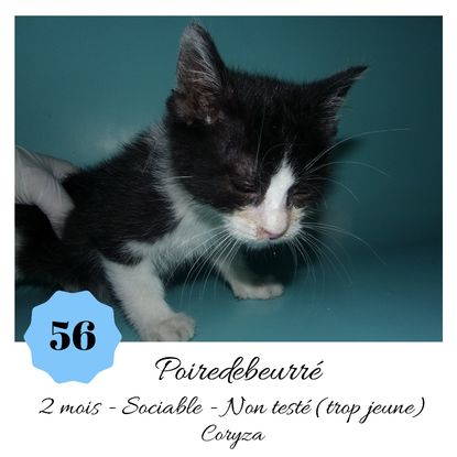 URGENCE EUTHANASIE ! Poire de Beurré est un chaton de 2 mois sociable qui vous attend dans une fourrière du 56. ATTENTION SORTIE AU PLUS TARD LE 25/10/2019 (avant euthanasie)! Pour adopter, c'est facile : ➡️ On se rend sur la page facebook d'Urgence Fourrière de Bretagne (UFB) -> https://www.facebook.com/sosfourrieresbreizh/ ➡️ On vient en message privé sur la page UFB ➡️ On remplit le questionnaire ➡️ Si le questionnaire est validé, on se rend disponible pour la pré-visite ➡️ On se rend aussi disponible pour venir chercher le loulou en fourrière Les chats sortent de fourrière primo-vaccinés et identifiés. Restera à charge de l’adoptant le rappel de vaccin et la stérilisation qui est OBLIGATOIRE. Les femelles en fourrière ayant été trouvées dans la rue, il y a fort à parier que nombre d'entre elles en âge de l'être soient gestantes ... ---- A PROPOS D'URGENCE FOURRIERE DE BRETAGNE (UFB) Nous sommes un COLLECTIF d'ASSOCIATIONS DE PROTECTION ANIMALE (qui rassemble notamment Moustaches et Compagnie, Bêtes de Scène, les Pachas, Chats Libres de Berné, etc, etc....) Le BUT de ce collectif d'associations est donc de SORTIR ces animaux des fourrières surchargées en les faisant ADOPTER de manière LEGALE par des familles ou en leur trouvant des FAMILLES D'ACCUEIL lorsque des places en association se libèrent.