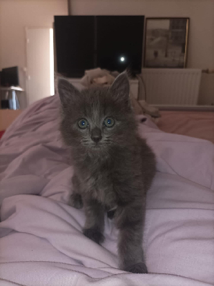 Onyx est un petit chat très sociable. Il a environ 2 mois et demi. Il a été retrouvé avec ses frères Winnie et Mambo dans un local poubelle, dans un centre commercial. Très câlin mais aussi très joueur, il saura vous combler.