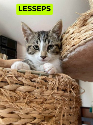 LESSEPS est un chaton tigré et blanc au regard très doux et expressif. Il est encore un peu timide mais se détend très vite car il aime les câlins et les gratouilles.