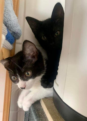 Ulysse, petit mâle noir et blanc, et sa sœur Kaya âgés de 2 mois et demi.