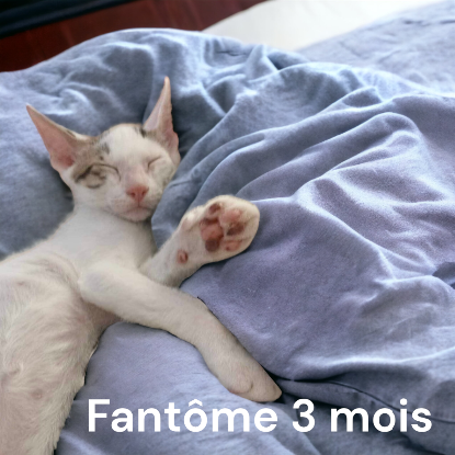 Fantome est un adorable petit chaton blanc de 2 mois. Il est un peu craintif au départ mais avec de la patience il devient vite joueur, câlin. Il est Propre.