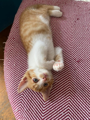 Bill, c’est celui qui a pris le joli poil roux de sa maman tricolore. Dans la catégorie espiègle, nous avons un professionnel ! Il vient dire bonjour dès qu’il entend du bruit et sait très bien y faire pour avoir le plus de caresses possible : il s’assoit bien devant sa cible, miaule et montre son petit ventre rond. C’est irrésistible…