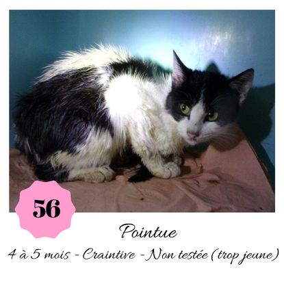 URGENCE EUTHANASIE ! Pointue est une minette de 4-5 mois craintive (en situation de fourrière) qui vous attend dans une fourrière du 56. ATTENTION SORTIE AU PLUS TARD LE 1/11/2019 (avant euthanasie) ! Pour adopter, c'est facile : ➡️ On se rend sur la page facebook d'Urgence Fourrière de Bretagne (UFB) -> https://www.facebook.com/sosfourrieresbreizh/ ➡️ On vient en message privé sur la page UFB ➡️ On remplit le questionnaire ➡️ Si le questionnaire est validé, on se rend disponible pour la pré-visite ➡️ On se rend aussi disponible pour venir chercher le loulou en fourrière Les chats sortent de fourrière primo-vaccinés et identifiés. Restera à charge de l’adoptant le rappel de vaccin et la stérilisation qui est OBLIGATOIRE. Les femelles en fourrière ayant été trouvées dans la rue, il y a fort à parier que nombre d'entre elles en âge de l'être soient gestantes ... ---- A PROPOS D'URGENCE FOURRIERE DE BRETAGNE (UFB) Nous sommes un COLLECTIF d'ASSOCIATIONS DE PROTECTION ANIMALE (qui rassemble notamment Moustaches et Compagnie, Bêtes de Scène, les Pachas, Chats Libres de Berné, etc, etc....) Le BUT de ce collectif d'associations est donc de SORTIR ces animaux des fourrières surchargées en les faisant ADOPTER de manière LEGALE par des familles ou en leur trouvant des FAMILLES D'ACCUEIL lorsque des places en association se libèrent.