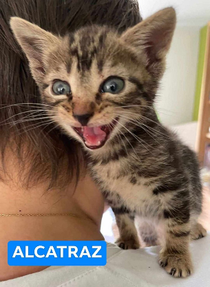 ALCATRAZ est un petit chaton un peu plus petit que ces sœurs mais qui sait occuper sa place et donner de la voix. Il aime beaucoup jouer avec ses sœurs. Il est plutôt malin et le premier à s'être échappé du parc à chaton en l'escaladant d'où son nom !