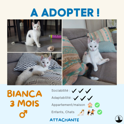 Pour Bianca nous cherchons une famille très présente. Bianca tolère les autres chats, mais préfère la présence des humains, adultes ou enfants ! Bianca peut vivre très heureuse en appartement, un extérieur n’est pas obligatoire.