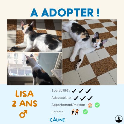 Pour Lisa nous cherchons une famille n’ayant pas d’autres animaux. En effet, Lisa aime l’exclusivité et préfèrera avoir toute l’attention Lisa aime beaucoup les enfants, elle pourra être très heureuse de partager sa vie avec eux. Un extérieur n’est pas obligatoire, Lisa a besoin d’un environnement enrichie et surtout de beaucoup de présence !