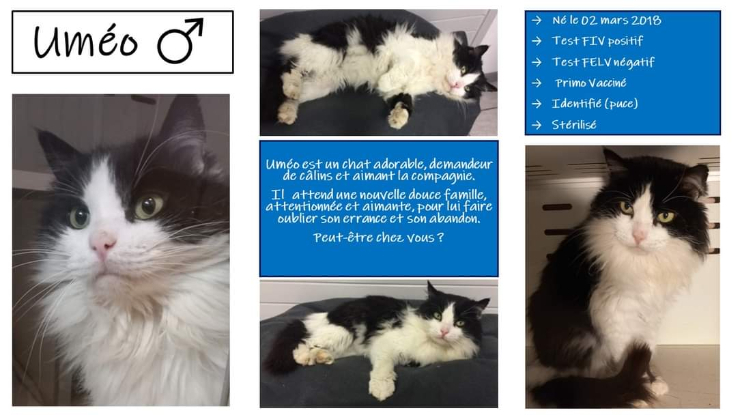 Umeo est un chat adorable, demandeur de câlins, et aimant la compagnie. Il attend une nouvelle douce famille, attentionnée et aimante pour lui faire oublier son errance et son abandon. Peut être chez vous?