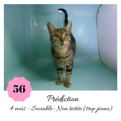 URGENCE EUTHANASIE ! Prédiction est une minette de 4 mois sociable qui vous attend dans une fourrière du 56. ATTENTION SORTIE AU PLUS TARD LE 1/11/2019 (avant euthanasie) ! Pour adopter, c'est facile : ➡️ On se rend sur la page facebook d'Urgence Fourrière de Bretagne (UFB) -> https://www.facebook.com/sosfourrieresbreizh/ ➡️ On vient en message privé sur la page UFB ➡️ On remplit le questionnaire ➡️ Si le questionnaire est validé, on se rend disponible pour la pré-visite ➡️ On se rend aussi disponible pour venir chercher le loulou en fourrière Les chats sortent de fourrière primo-vaccinés et identifiés. Restera à charge de l’adoptant le rappel de vaccin et la stérilisation qui est OBLIGATOIRE. Les femelles en fourrière ayant été trouvées dans la rue, il y a fort à parier que nombre d'entre elles en âge de l'être soient gestantes ... ---- A PROPOS D'URGENCE FOURRIERE DE BRETAGNE (UFB) Nous sommes un COLLECTIF d'ASSOCIATIONS DE PROTECTION ANIMALE (qui rassemble notamment Moustaches et Compagnie, Bêtes de Scène, les Pachas, Chats Libres de Berné, etc, etc....) Le BUT de ce collectif d'associations est donc de SORTIR ces animaux des fourrières surchargées en les faisant ADOPTER de manière LEGALE par des familles ou en leur trouvant des FAMILLES D'ACCUEIL lorsque des places en association se libèrent.
