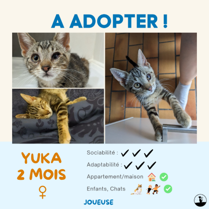 Yuka est un petit amour de chaton Elle est très joueuse et dynamique. Elle adore jouer avec ses congénères chats ou avec l’humain. Extrêmement attentive à l’homme, elle aime observer son humaine. Elle réclamera aussi beaucoup de présence pour assouvir ses besoins de câlins.
