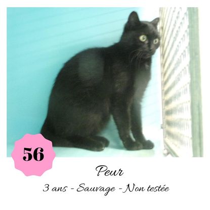 URGENCE EUTHANASIE ! Peur est une minette de 3 ans sauvage (en situation de fourrière) qui vous attend dans une fourrière du 56. ATTENTION SORTIE AU PLUS TARD LE 1/11/2019 (avant euthanasie) ! Pour adopter, c'est facile : ➡️ On se rend sur la page facebook d'Urgence Fourrière de Bretagne (UFB) -> https://www.facebook.com/sosfourrieresbreizh/ ➡️ On vient en message privé sur la page UFB ➡️ On remplit le questionnaire ➡️ Si le questionnaire est validé, on se rend disponible pour la pré-visite ➡️ On se rend aussi disponible pour venir chercher le loulou en fourrière Les chats sortent de fourrière primo-vaccinés et identifiés. Restera à charge de l’adoptant le rappel de vaccin et la stérilisation qui est OBLIGATOIRE. Les femelles en fourrière ayant été trouvées dans la rue, il y a fort à parier que nombre d'entre elles en âge de l'être soient gestantes ... ---- A PROPOS D'URGENCE FOURRIERE DE BRETAGNE (UFB) Nous sommes un COLLECTIF d'ASSOCIATIONS DE PROTECTION ANIMALE (qui rassemble notamment Moustaches et Compagnie, Bêtes de Scène, les Pachas, Chats Libres de Berné, etc, etc....) Le BUT de ce collectif d'associations est donc de SORTIR ces animaux des fourrières surchargées en les faisant ADOPTER de manière LEGALE par des familles ou en leur trouvant des FAMILLES D'ACCUEIL lorsque des places en association se libèrent.