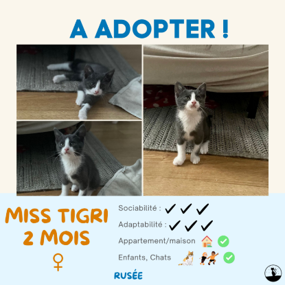 Pour Miss Tigri nous cherchons une famille qui puisse être très présente, ou bien possédant déjà un compagnon chat. Miss Tigri se satisfera aussi très bien de l’exclusivité de ses humains, pour vu qu’ils soient extrêmement présent pour elle !