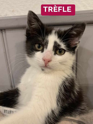 Chaton femelle, âgée d’environ de 2 mois, noir et blanche, très câline et joyeuse, elle adore découvrir de nouvelles activités et elle aime venir se blottir contre vous pour une petite sieste. Cette petite puce adore le contact humain.