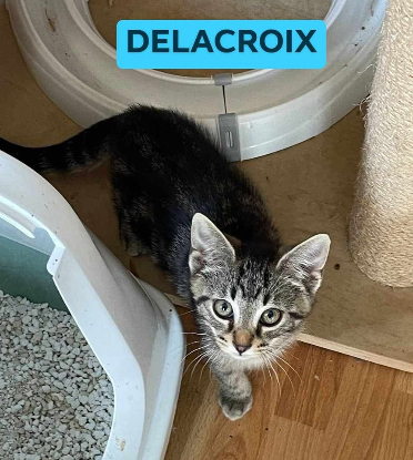 DELACROIX est un chaton de 3 mois encore un peu timide qui aime observer les autres en train de jouer mais aussi participer à leurs jeux. Il aura besoin d'un environnement calme mais aussi d'adoptants patients pour qu'il devienne un chat bien dans ses patounes.