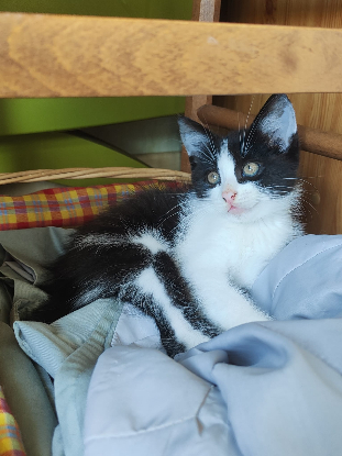 Cosmo, avec ses frères et soeur, malgré son très jeune âge, a connu une histoire pleine de rebondissements. Un matin en allant cueillir des cerises dans son jardin une dame fait une récolte un peu inhabituelle, un tout petit chaton. La dame avec sa petite fille ont acheté du lait spécial pour chatons en pharmacie car il faisait très chaud, et elles ne voulaient pas risquer une déshydratation. La famille a biberonné cette minuscule boule de poils, puis on entamé une enquête de voisinage afin d'essayer de retrouver ses propriétaires, sans succès. Le soir même, elles ont entendu miauler dans le jardin... C'était la maman, qui a reconnu l'odeur de sa fille ! Pour le bien-être et le sevrage du chaton elles ont laissé la mère repartir avec sa petite, mais n'ont pas réussi à les suivre pour trouver où elles allaient se réfugier. Elles pensaient donc cette histoire terminée... Jusqu'à ce que, quelques jours plus tard, une voisine découvre dans son jardin 3 chatons, dont Cosmo, cachés dans son tas de bois à l'abri sous une bâche ! C'était la petite Cerise (avec ses frères), et sa maman qui surveillait tout ce petit monde. La voisine a gentiment accepté de nourrir la mère, mais étant allergique aux chats elle ne pouvait pas faire plus en les sécurisant chez elle, et ils étaient trop jeunes pour être délogés tout de suite sans leur maman, alors tous les jours la grand-mère est allés les voir pour instaurer une relation de confiance avec la mère, et nous avons découvert que finalement ils étaient 4 ! Quand ils ont eu 1 mois et demi elles les ont attrapé afin de les sécuriser et de commencer leur socialisation, et Maman-chat les a suivi de son plein gré, n'allant pas dire non au doux confort d'un foyer !