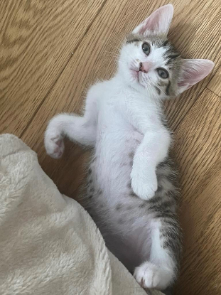 Petite chatonne à la robe blanche et tigrée très observatrice à la recherche de nouvelles aventures, sociable, c'est une vraie boîte à ronrons et saura vous récompenser de doux câlins après une petite sieste reposante