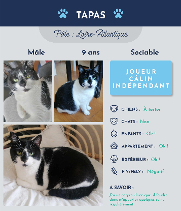 Chalut moi c'est Tapas, un beau mâle de 9 ans. Je suis un chat plutôt joueur et qui adore les sources de distractions ! J'aime aussi vous faire des câlins et vous réclamer des papouilles. La sieste est également un de mes passe-temps favoris ! Je ne suis pas attiré par l'extérieur, je préfère rester à vos côtés. Je suis un chat indépendant la journée mais le soir je vous attendrai pour pouvoir passez du temps avec vous.