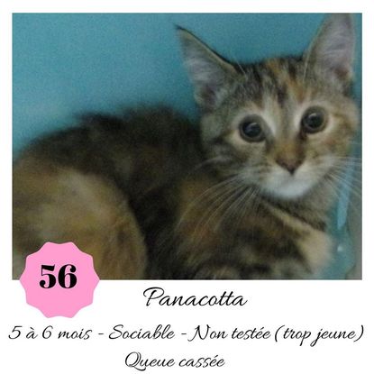 URGENCE EUTHANASIE ! Panacotta est une minette de 5-6 mois sociable qui vous attend dans une fourrière du 56. ATTENTION SORTIE AU PLUS TARD LE 8/11/2019 (avant euthanasie) ! Pour adopter, c'est facile : ➡️ On se rend sur la page facebook d'Urgence Fourrière de Bretagne (UFB) -> https://www.facebook.com/sosfourrieresbreizh/ ➡️ On vient en message privé sur la page UFB ➡️ On remplit le questionnaire ➡️ Si le questionnaire est validé, on se rend disponible pour la pré-visite ➡️ On se rend aussi disponible pour venir chercher le loulou en fourrière Les chats sortent de fourrière primo-vaccinés et identifiés. Restera à charge de l’adoptant le rappel de vaccin et la stérilisation qui est OBLIGATOIRE. Les femelles en fourrière ayant été trouvées dans la rue, il y a fort à parier que nombre d'entre elles en âge de l'être soient gestantes ... ---- A PROPOS D'URGENCE FOURRIERE DE BRETAGNE (UFB) Nous sommes un COLLECTIF d'ASSOCIATIONS DE PROTECTION ANIMALE (qui rassemble notamment Moustaches et Compagnie, Bêtes de Scène, les Pachas, Chats Libres de Berné, etc, etc....) Le BUT de ce collectif d'associations est donc de SORTIR ces animaux des fourrières surchargées en les faisant ADOPTER de manière LEGALE par des familles ou en leur trouvant des FAMILLES D'ACCUEIL lorsque des places en association se libèrent.
