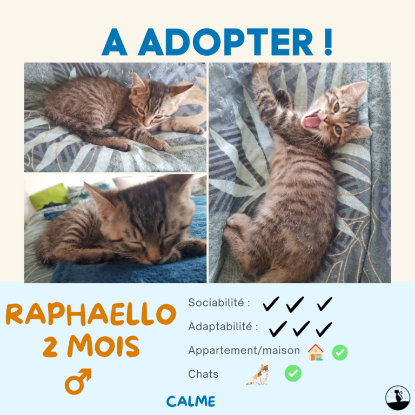 Raphaëllo est le chaton le plus doux et calme de la bande (même si il ne dit jamais non à une partie de jeu !) Raphaëllo c’est un petit chat timide au début, il a besoin de calme pour se sentir en confiance. Mais par la suite, c’est un vrai petit pot de colle ! Il aime beaucoup dormir proche de son humaine la nuit, cela le rassure