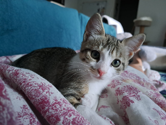 Je suis une petite chatte très sociable, j’aime tout le monde, même les autres chats. J’adore la compagnie des humains, même si honnêtement je comprends pas grand-chose de ce qu’ils disent, j’adore participer à leurs discussions à ma manière. Parfois, il m’arrive de vouloir miauler mais j’ai tellement papoté avant que je n’ai plus de voix donc aucun son ne sort ! Ma famille d’accueil se moque de moi dans ces moments-là. Mais pas grave, je les aime quand même et à défaut de ne pas pouvoir le dire, je le prouve. Des câlins, des ronrons, de la tendresse, tout pour passer un agréable moment et aussi recharger mes batteries et retrouver ma jolie voix ! Tout ça, en étant bien enfouie dans un plaid tout doux et là … Rompich!
