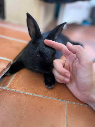 Ses grandes oreilles et son magnifique pelage noir n’ont pas manqué de charmer nos bénévoles Et la visite vétérinaire nous l’a confirmé : Moon est en bonne santé, et sera un grand lapin d’environs 3-4 kg .