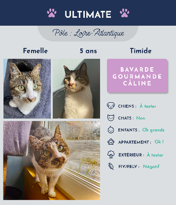 Chalut ! Moi c'est Ultimate, une jolie femelle de 5 ans ! Lorsque je ne connais pas je préfère vous observer de loin, mais une fois en confiance je suis une machine à câlins ! J'ai toujours plein de choses à vous dire et j'adore observer les gens qui passent devant la fenêtre. Ma passion: MANGER ! Je suis un véritable ventre sur pattes qui sait se faire entendre pour que l'on remplisse sa gamelle ! Je ne suis jamais sortie à l'extérieur mais ça ne me dérange pas tant que j'ai mon petit confort dans la maison ! Vous êtes une famille patiente, chez qui je pourrais être la reine de la maison ? Alors ne cherchez plus, je suis là !