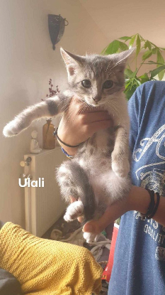 Ulalie est une très jolie chatonne de 2 mois et demi. C'est la sœur de Urbain et Ursana. Elle est blanche et tigrée gris