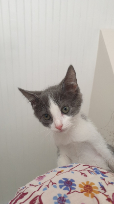 Alice est un chaton de 2 mois et demi. Elle aime jouer, elle aime aussi les câlins et ronronne facilement, mais elle est un peu timide.