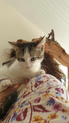 Cléopâtre est un chaton de 2 mois et demi. Elle aime les caresses, mais est timide.
