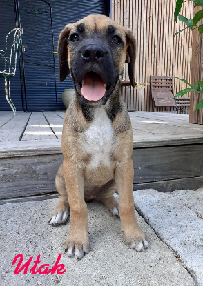 Utak vit encore avec ses parents, un père Boxer pure race et une mère croisée Dalmatien/Border, elle est donc parfaitement sevrée et connait les codes canins. Elle fera environ 30 kg adulte, il s’agit donc de gros gabarits