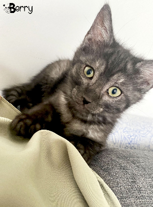 BERRY est un amour de chaton, très affectueuse et joueuse. Elle est très sociable et s’entend aussi bien avec le reste de la portée qu’avec la chatte de sa famille d’accueil, avec laquelle elle partage son panier. Enfin, son beau regard vous fera complètement craquer !