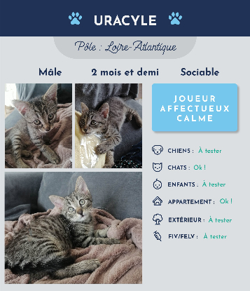 Salut, Mon prénom à moi c’est Uracyle et j’ai 2 mois et demi. Je suis intrigué par tous les bruits qui m’entourent, surtout si ça vient d’un humain. J’adore jouer avec des bouts de ficelle et des petites boules qui roulent partout. J’adore aussi me coller contre les humains quand c’est l’heure de ma sieste. Souvent quand je mange mes croquettes ça m’arrive de ronronner et de mettre ma tête comme si je dormais dans les croquettes (d’ailleurs c’est possible que ça arrive parfois je pense). J’aime bien jouer avec les pieds des humains aussi. J’aime bien avoir un endroit où je peux être au calme.
