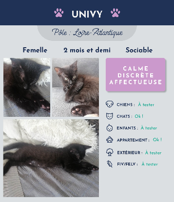 Bonjour, Moi c’est Univy, une petite chatte toute noire de 2 mois et demi. Même mes coussinets sont tout noirs. Mais pas de panique, contrairement à la rumeur je ne porte pas du tout malheur. Je suis d’une nature plutôt calme, même si j’aime bien jouer également ! Surtout avec mes frères ou avec la petite tache rouge magique qui bouge toute seule. Je suis facilement effrayée par le bruit de l’aspirateur et s’il m'approche, je bondis facilement en arrière. Je suis très silencieuse, je ne miaule pratiquement jamais et même quand je ronronne je le fais très faiblement. J’aime bien dormir à côté de mon humain actuel ou contre mes frères.