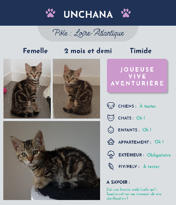 Bonjour, je suis Unchana ! J'ai environ 2 mois 1/2. Je suis vraiment très jolie, j'ai une robe magnifique avec une petite tête d'égyptienne. Je suis joueuse mais encore méfiante vis-à-vis de l'homme, il faudra être patient avec moi au début. Ma maman d’accueil dit que ceux qui viendront me chercher seront des amoureux des chats. Je suis très vive, je serai une grande chasseuse, si vous avez des souris, c'est moi qu'il vous faut ! Mais je vais aussi aimer dormir dans la maison au soleil derrière la baie vitrée et sur vos genoux. Comme vous l'avez compris, il me faudra de l'espace pour me dépenser, un jardin avec des arbres où grimper et jardiner avec vous. Venez me voir rapidement, je grandis tellement vite !