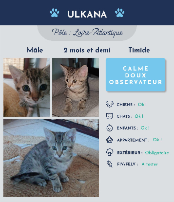 Salut, moi c’est Ulkana je suis un petit chaton de 2 mois et demi timide, calme et joueur quand je suis en confiance. Je suis souvent perché sur mon arbre à chat à observer ce qui se passe dans la maison. Pas très gourmand, je préfère dormir.
