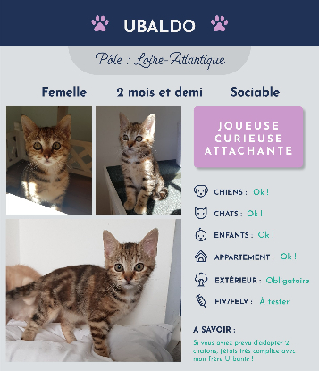 Bonjour, je suis Ubaldo, une très jolie petite chatte de 2 mois ½. Pas farouche du tout, je suis très attachante, ma maman d’accueil n'arrête pas de m'attrapper pour me faire des bisous… j'essaie de me dérober mais je n'y arrive pas toujours ! vous allez succomber très vite, je viens dès qu'on me propose de jouer avec n'importe quoi. Je me laisse caresser et je ronronne facilement. ! Une maison avec des enfants serait idéale pour moi, ils vont s'amuser autant que moi ! Il me faudra un petit coin de verdure car je suis née dans les bottes de foin et le grand air me manque. Venez me voir, j'ai hâte de vous rencontrer... Dépêchez vous, je grandis vite !